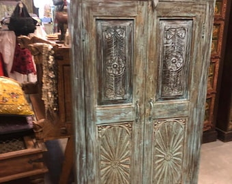 Rustic vINTAGE Blue Old Doors Armoire Cabinet Chakra Carving Antique Storage Chest FARMHOUSE COUNTRY CHIC
