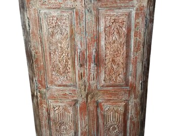 uNique Old Vintage Architectural remnants Wooden Wardrobe Armoire Carving Indian Antique Cabinet Storage