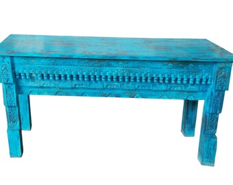 Teal Blue Antique Console Table Beautiful Hand Carved Sofa Table Vintage Distressed Solid Wooden RUSTIC 59L