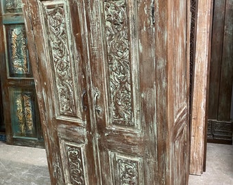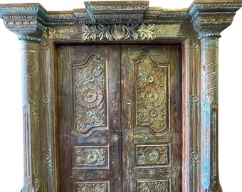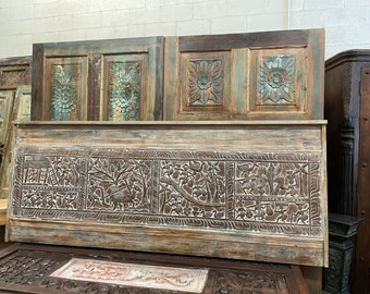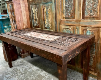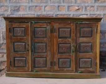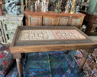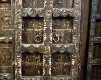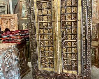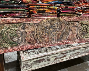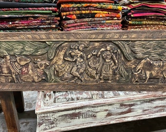 Indian decor is rich in color, pattern and texture, an authentic antique damchiya fills the room with exotic flair. An antique Indian bench made from oxcarts and layered with colorful pillows, transforms this urban New York apartment into a vibrant, energetic space. Block printed cotton throws are scattered on the sofas and an antique triple arch graces the main wall of the living room. Unique architectural remnants and paintings are the focus and give a pop of color against the white wall. A huge brass cladded hope chest sits in the foyer and is useful to store extra blankets.